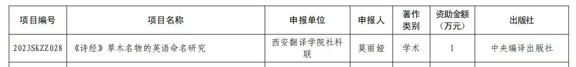 近日,陕西省社会科学界联合会公布了2023年度陕西省社科著作出版资助项目立项名单,共立项35项,其中学术类27项、科普类8项。我院莫丽娅副教授申报的《<诗经>草木名物的英语命名研究》获批,资助经费1万元,近期将由中央编译出版社出版。