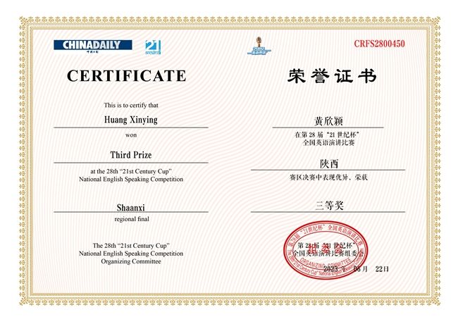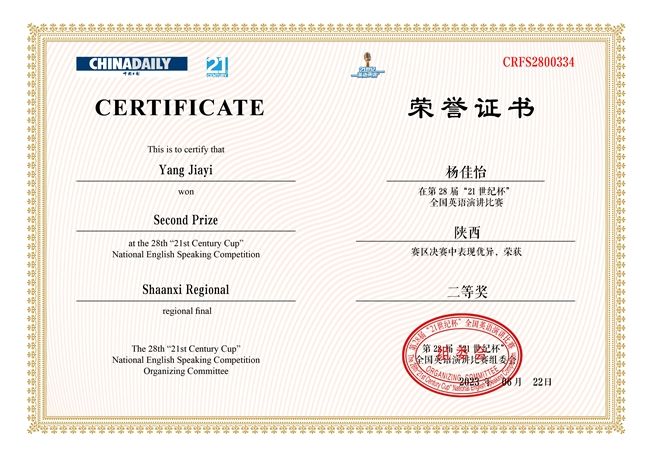 近日,由中国日报社主办、21世纪英语教育传媒承办的“21世纪杯”全国英语演讲比赛陕西赛区决赛圆满落幕。西安翻译学院英文学院杨佳怡和黄欣颖两位同学分别荣获省级二等奖和三等奖的优异成绩。