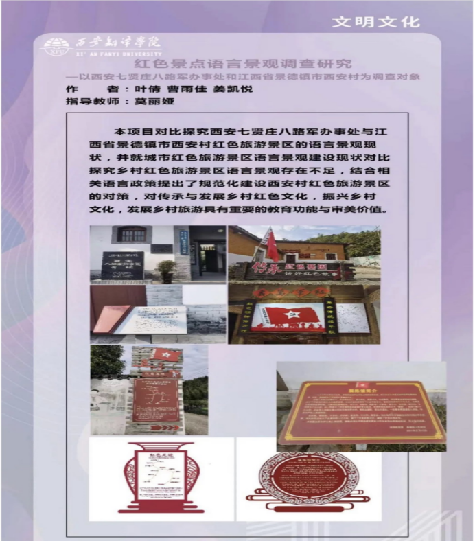 大赛启动以来,英文学院高度重视,精心组织、广泛动员,对参赛项目悉心指导,采取“项目汇报+问辩” “项目路演+针对辅导”等辅导模式,邀请多位专业教师,结合历年项目案例和学院特色,富有前瞻性地为项目提供了宝贵的经验与参考。参赛师生积极备战、克服困难,利用课余时间不断打磨,项目内容得到充分增进,答辩能力得到明显提升。经过校级初赛、复赛、终审决赛,英文学院莫丽娅副教授指导、叶倩、曹雨佳、姜凯悦代表队的调研作品《红色景点语言景观调查研究——以西安七贤庄八路军办事处和江西省景德镇市西安村为调查对象》入围省赛,并最终获得省赛一等奖的好成绩。