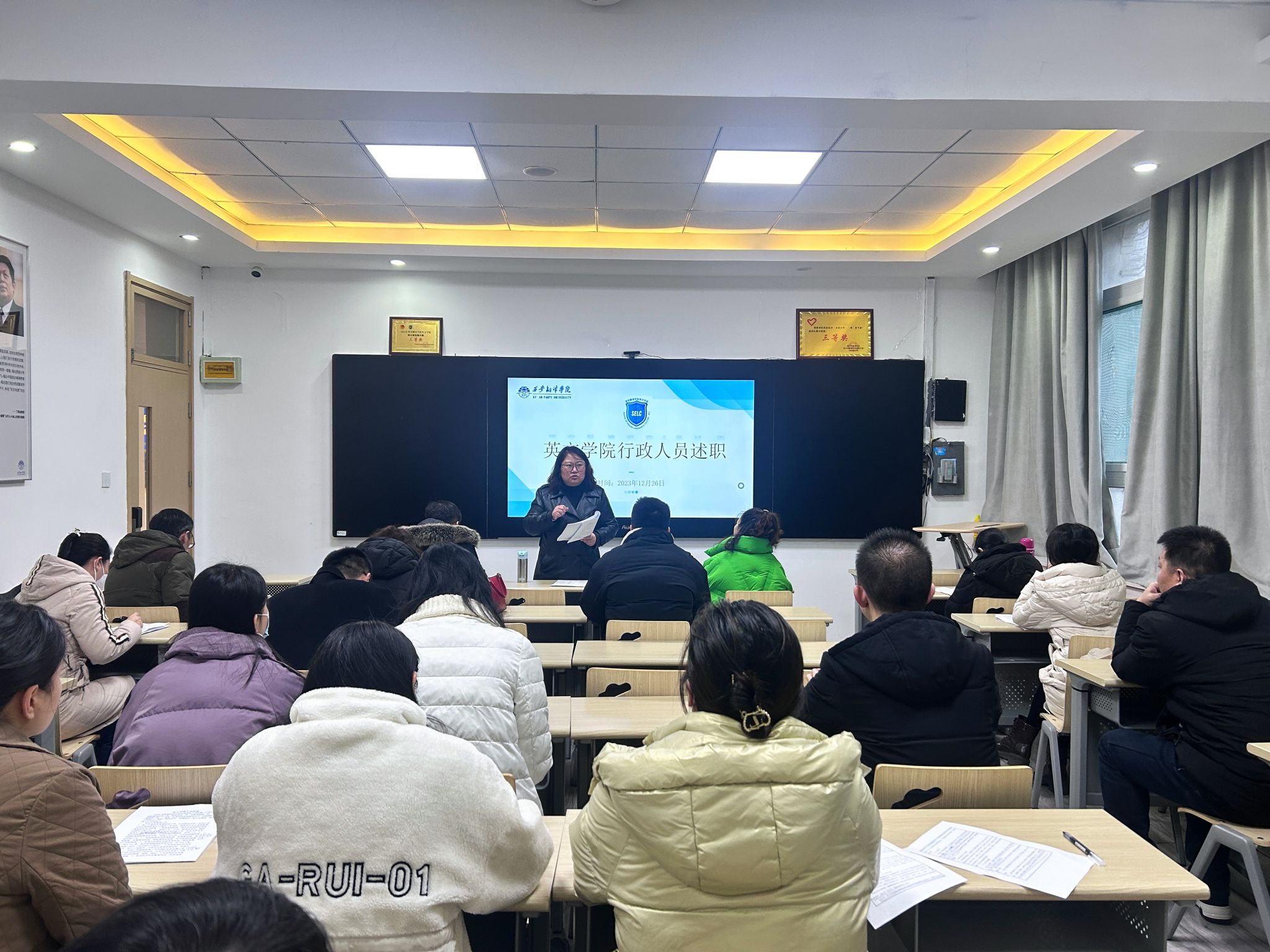 为深入贯彻落实习近平新时代中国特色社会主义思想和党的二十大精神,进一步落实“立德树人”根本任务,推动学院学风、班风建设,激励教职工认真履行岗位职责,英文学院12月26日开展2023年度行政人员、辅导员述职评议。英文学院党委副书记、副院长王珍主持会议,英文学院全体行政人员、辅导员参加述职。