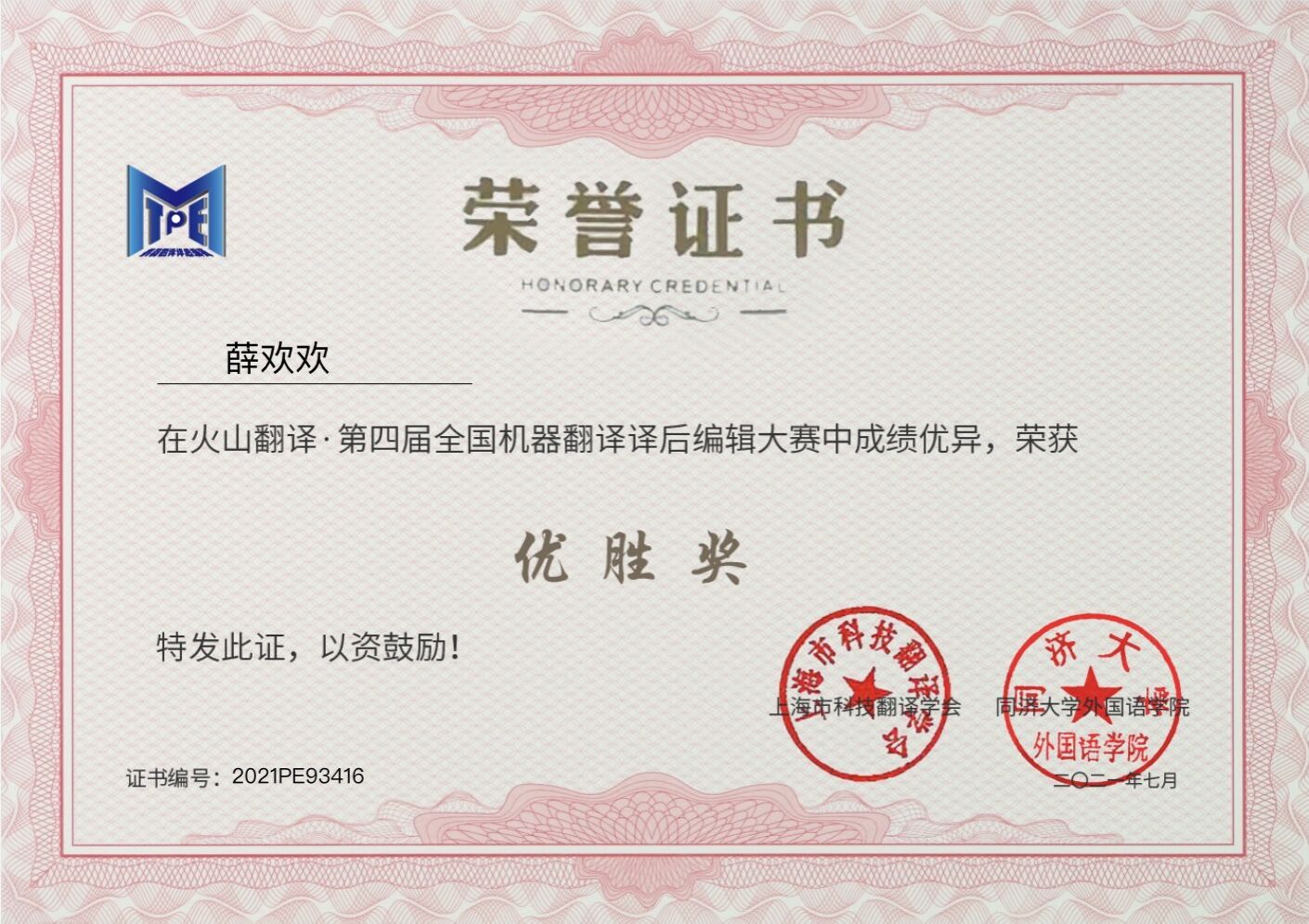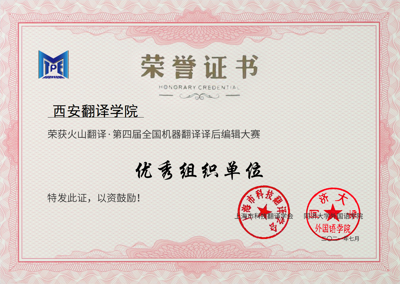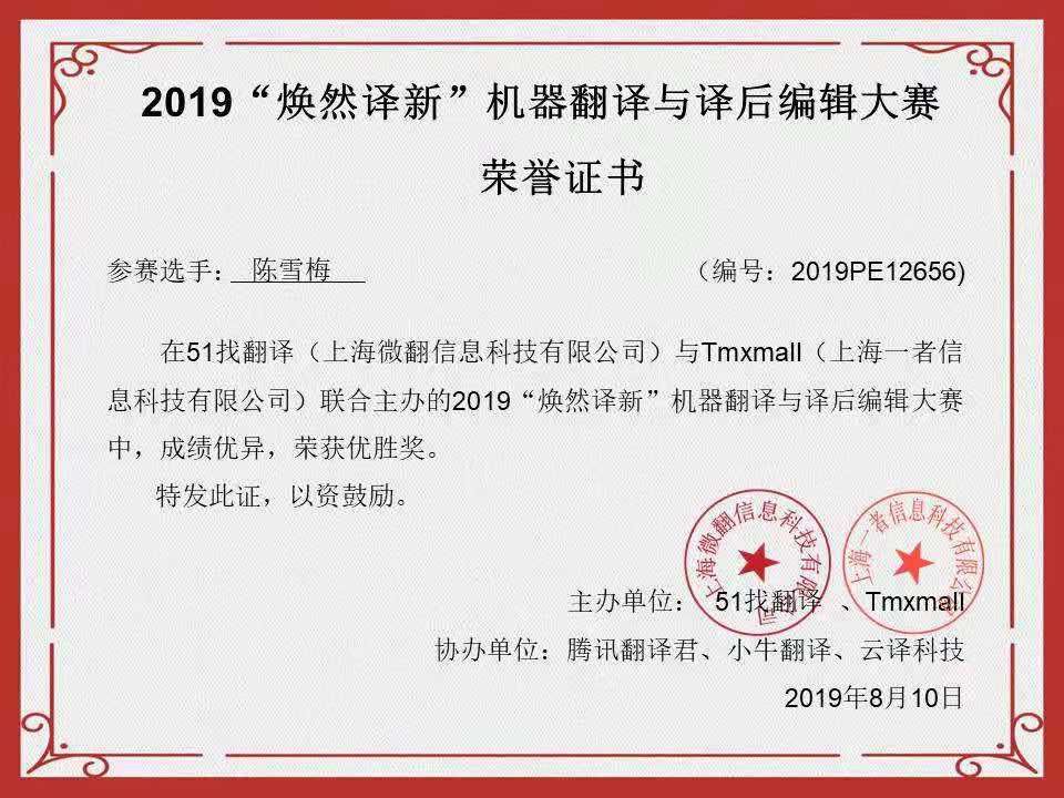 全国机器翻译与译后翻译编辑大赛是一项全国性学科竞赛,目前已连续举办四届。该竞赛由同济大学外国语学院与上海科技翻译学会联合主办,全国翻译专业学位研究生教育指导委员会任指导单位。该竞赛参加者主要是高校的翻译业余爱好者与企事业单位的职业译员,且大赛对国内外选手开放。目前,我院学生已连续参加三届,取得第二届全国机器翻译与译后翻译编辑大赛优秀奖1个、第三届全国机器翻译与译后翻译编辑大赛优秀奖1个、第四届全国机器翻译与译后翻译编辑大赛优秀奖2个,并获得第四届全国机器翻译与译后翻译编辑大赛优秀组织单位奖。