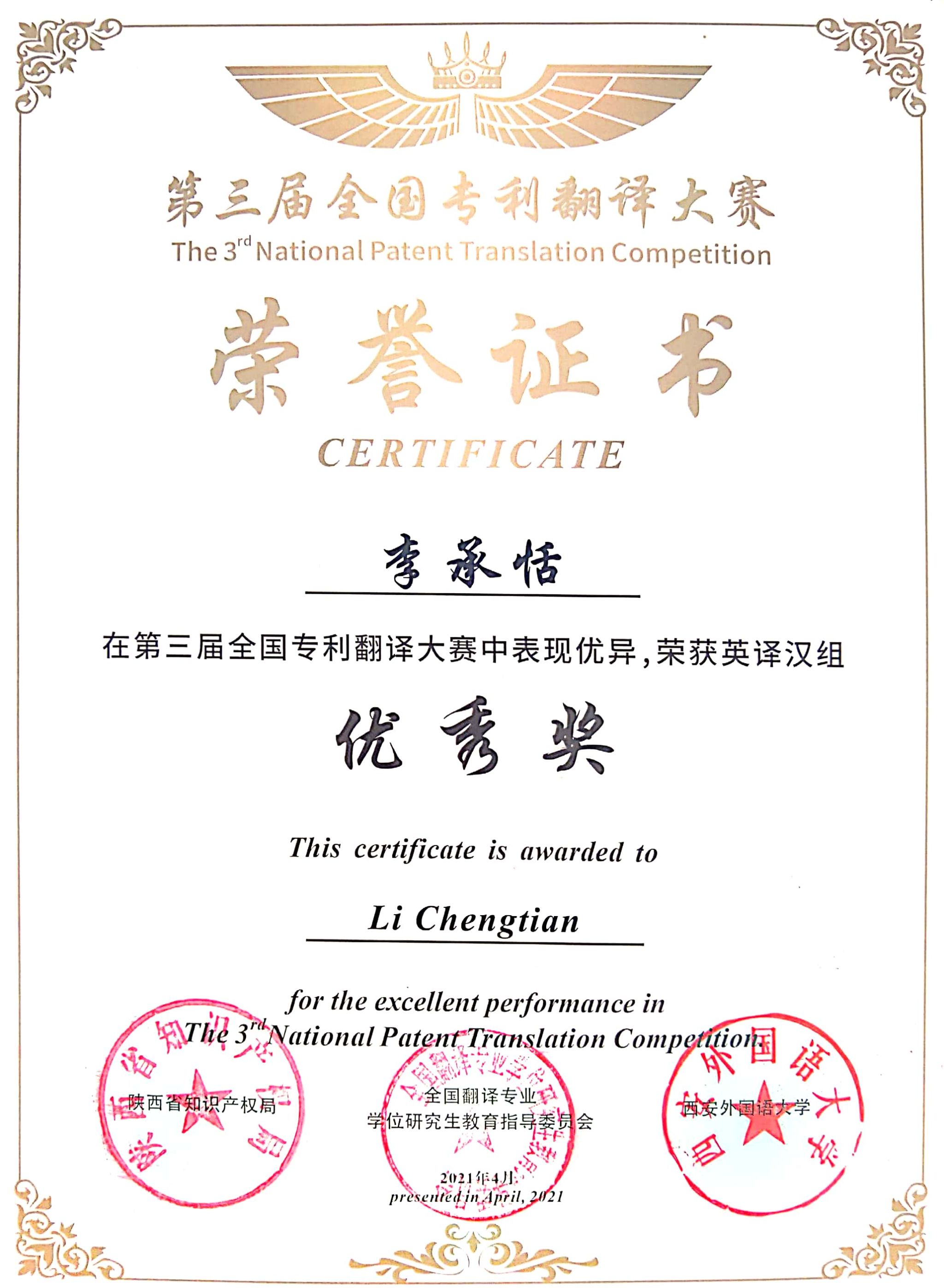 全国专利翻译大赛是一项强化知识产权保护、推动知识产权与翻译学科紧密融合的全国性翻译学科竞赛,主办单位为西安外国语大学主,指导单位为全国翻译专业学位研究生教育指导委员会、陕西省知识产权。旨在在全社会夯实知识产权语言服务人才培养根基。目前,在2021年第三届全国专利翻译大赛中,英语专业共获优秀奖两项。
