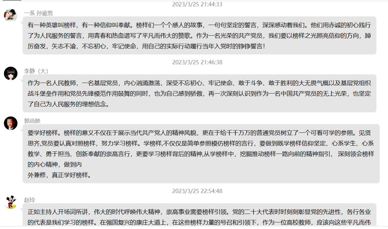 2. 支部学习氛围浓厚。支部党员学习观看后,纷纷发表感言,皆表示,要以榜样为镜,不仅要在工作中严于律己,在生活中也要时刻督促自己,提高党性觉悟,严守纪律底线,做好自己的本职工作,以实际行动践行初心使命,作到心中无愧,在教师岗位中,散发自己的光和热,为祖国建设作出一份贡献。