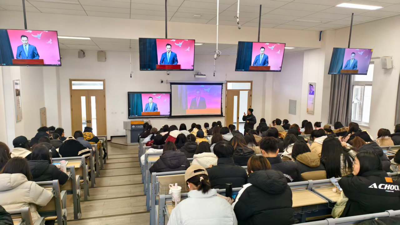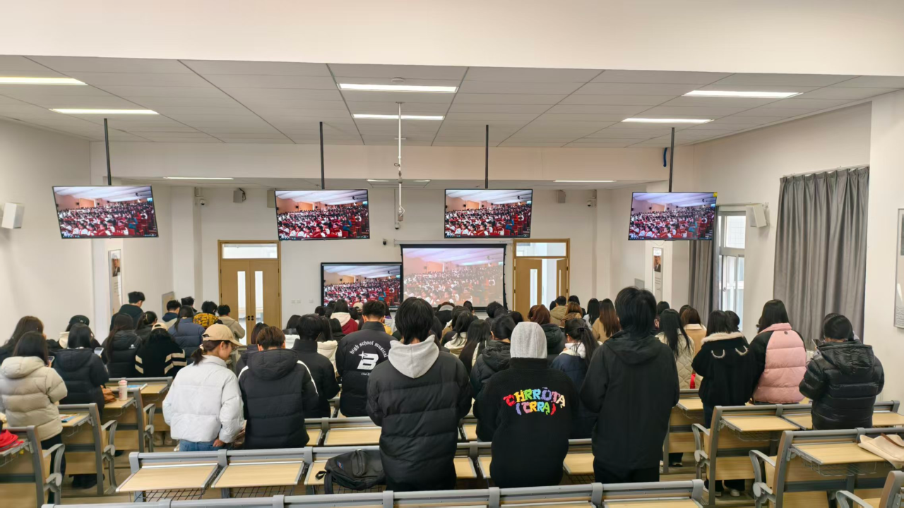 上午9:50分,120余名同学齐聚10T31教室,目光聚焦屏幕,跟随直播中的领读人手持宪法读本,齐声诵读宪法序言及公民基本权利与义务等核心章节。朗朗书声与直播信号中的诵读声交织共鸣,同学们神情专注、语调庄重,在逐字逐句的跟读中,真切感受宪法作为国家根本大法的庄严权威,深刻体悟"治国安邦总章程"的深刻内涵。