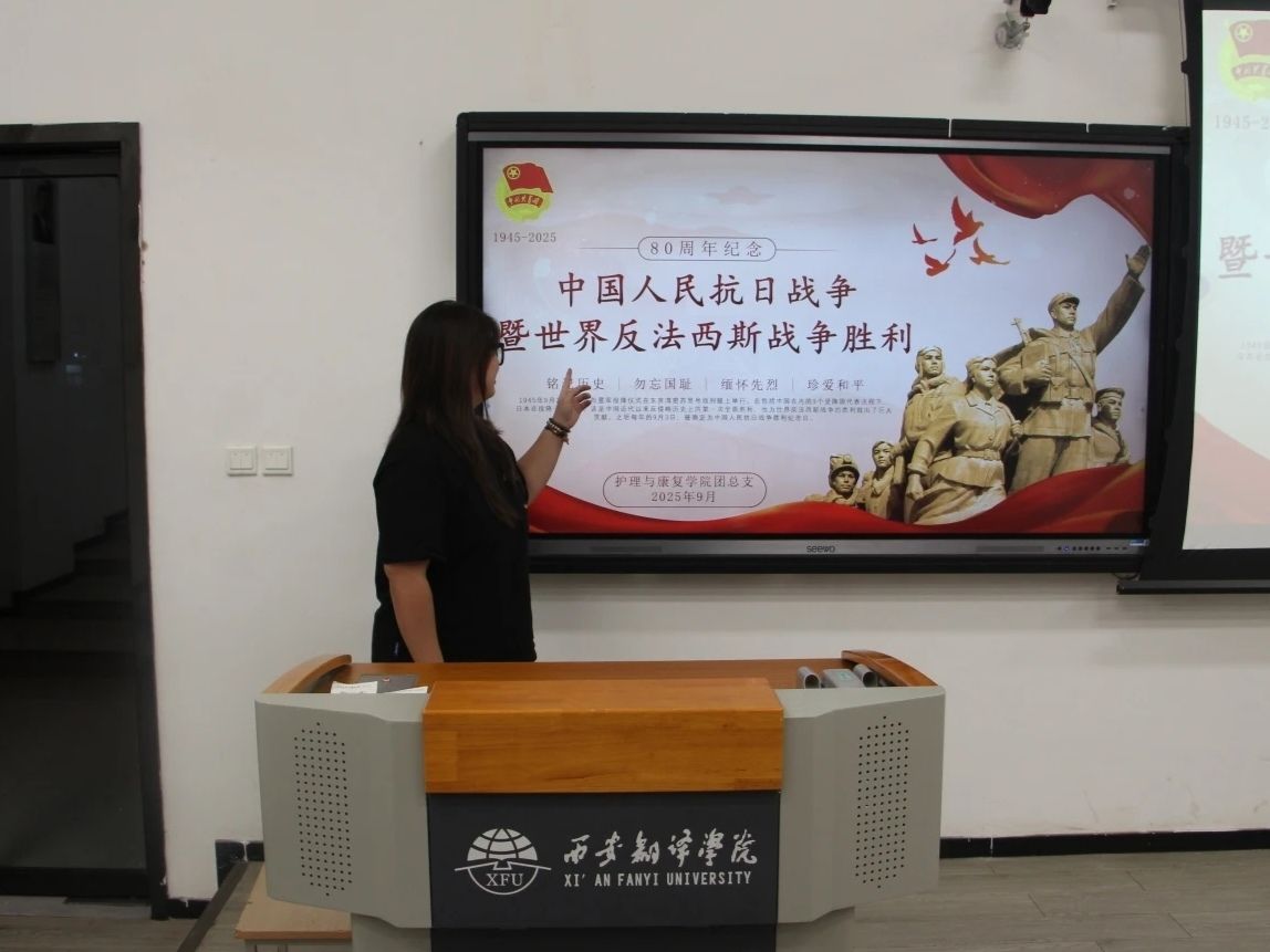 为纪念中国人民抗日战争暨世界反法西斯战争胜利80周年,护理与康复学院于2025年9月3日,组织主题团日活动,回顾抗战历史,汲取奋进力量,彰显当代青年的爱国情怀与使命担当。