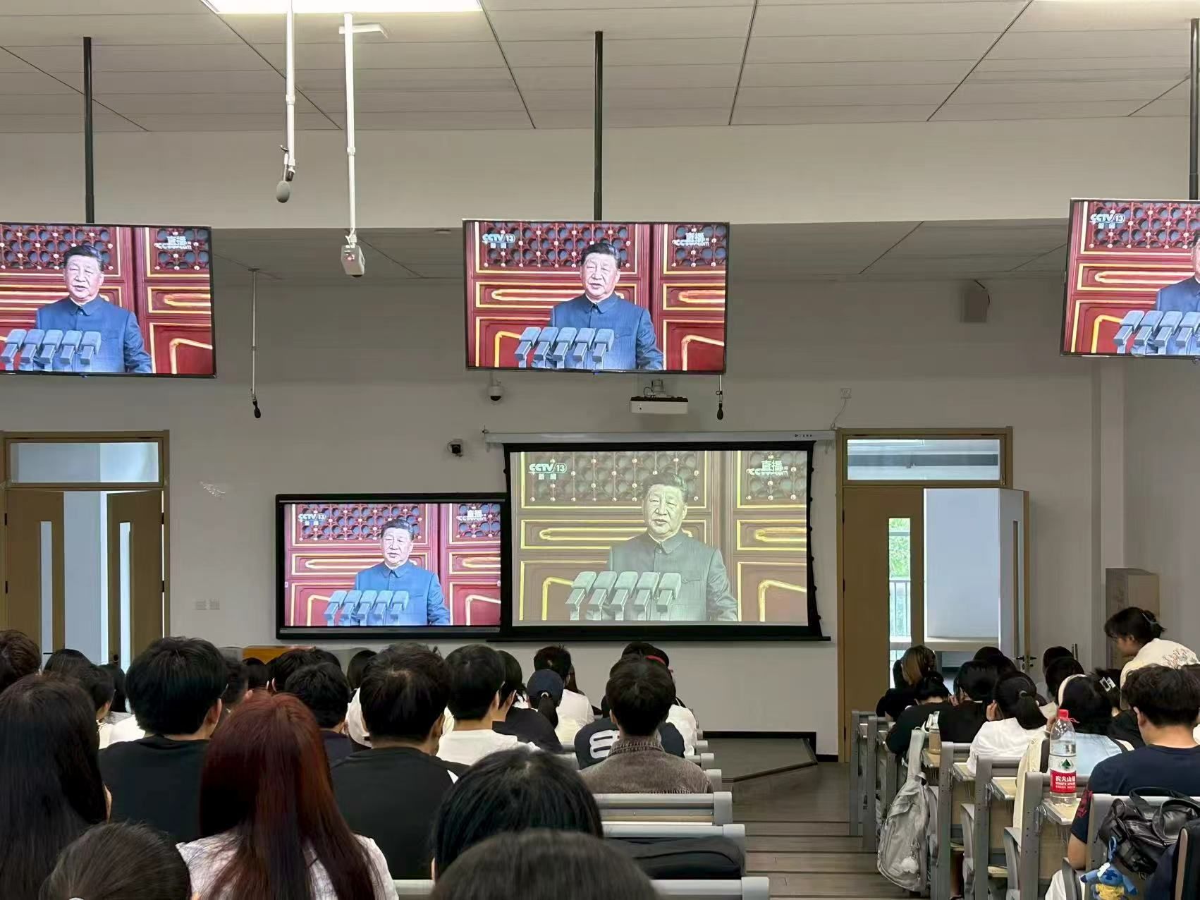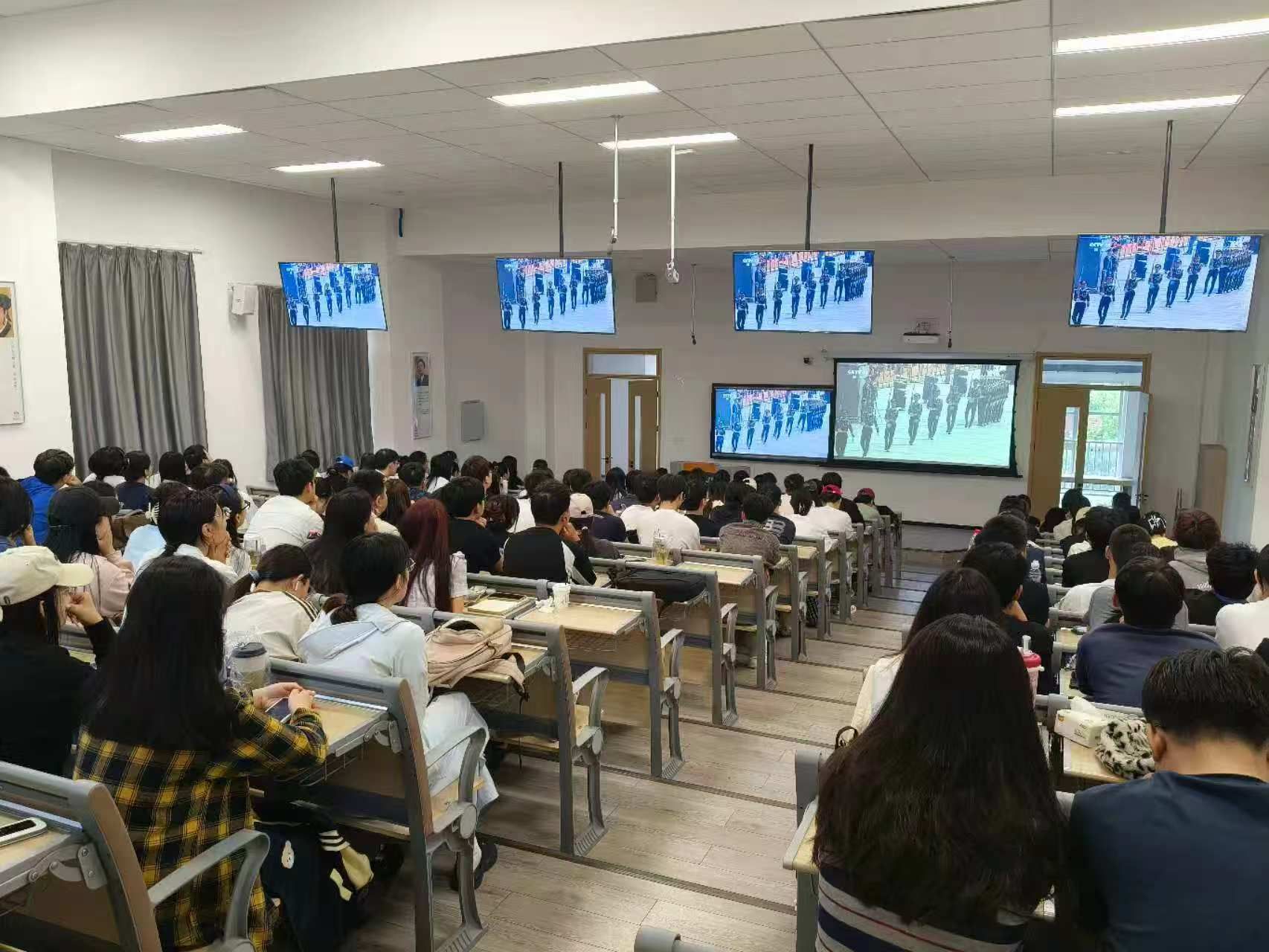 集中观看现场,屏幕中的五星红旗如朝霞般舒展,雄壮的国歌声响彻天安门广场,屏幕前的全体师生庄严肃立、目光热切,共同注视着直升机空中护旗梯队护卫鲜艳的一抹红色率先通过广场,共同见证国家日益繁荣昌盛、军队不断发展壮大的景象;“一老一新”的徒步方队、“无畏向前”的战旗方队、“国之重器”的装备方队与空中梯队整齐划一地从天安门经过。阅兵仪式上,步伐矫健,气势如虹的受阅方队、先进精良的武器装备,展现了我国强大的国防实力和军队的良好精神风貌。全体学生目光紧随受阅方阵与装备,为强国强军的伟大成就深感自豪。