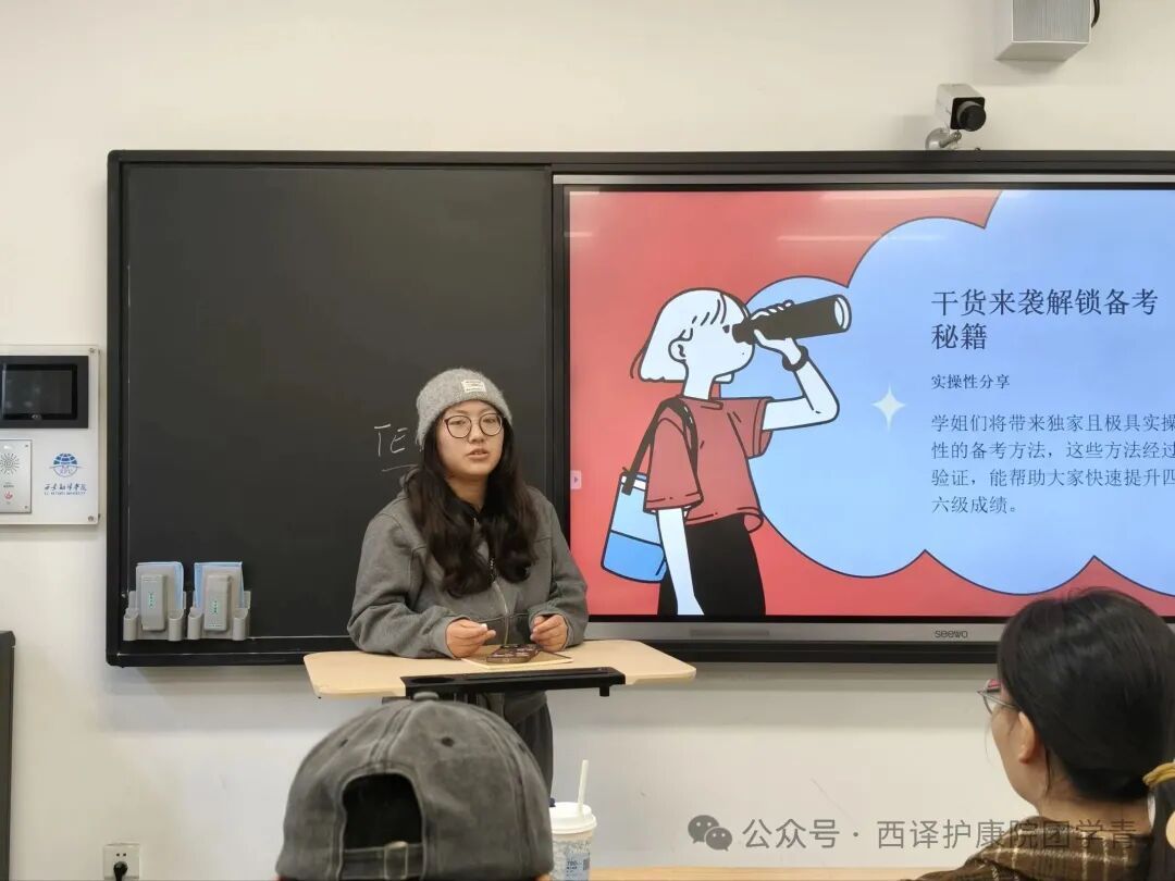 在分享会上,三位学姐倾囊相授备考秘籍。苗晴雯重点讲解听力“视听一致”原则,指导同学们预判选项、捕捉关键信息,还推荐了实用训练软件;同时强调写作的逻辑结构与高质量模板的重要性,助力大家首战稳扎稳打。王艺璇针对翻译题型分享核心策略,指出翻译需做到准确达意,注重表达流畅地道,还详细分享了翻译技巧与词汇积累方法。张欣悦则聚焦阅读部分,讲解如何快速定位关键信息、判断题目类型及灵活运用解题技巧,同步推荐了优质阅读训练资料与网站,帮助大家高效提升阅读速度和理解能力。