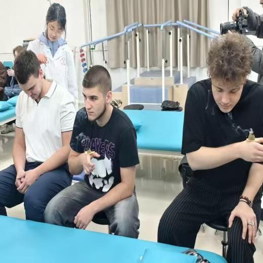 在实操体验区,俄罗斯交换生们兴致盎然、踊跃参与,亲身感受中医疗法的神奇效果。针灸体验区,副部长蒋啸精准取穴、规范操作,让学子们直观领略中医外治的独特疗效;推拿体验区,专职教师杨帅与景岩老师以专业手法舒筋活络,让俄罗斯学生们在舒缓放松中体会经络通畅之感;拔罐与艾灸体验区,艾香袅袅、温煦绵长,学子们沉浸式感受中医“温养调理”的养生智慧;脉诊体验台前,张天瑶老师细致讲解“望、闻、问、切”辨证思路,生动阐释中医“司外揣内”的诊疗思维。