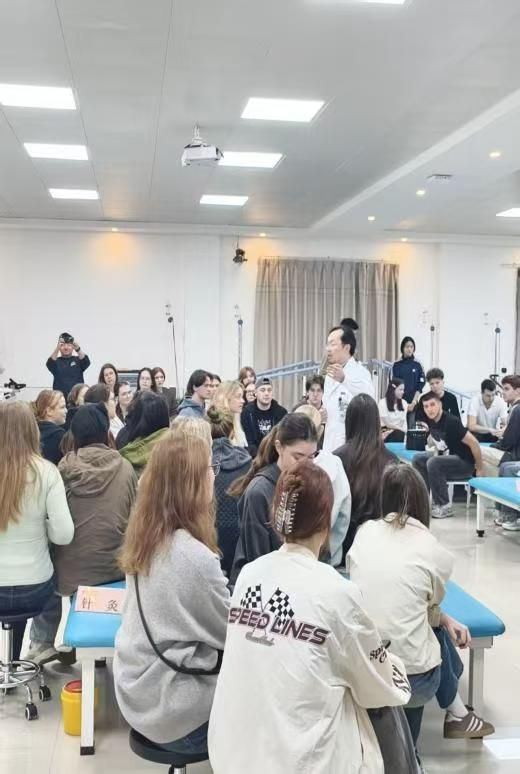 当千年岐黄之术邂逅异域青春风采,一场跨越山海的文化交流在西安翻译学院健康与体育学部温情上演。2026年4月8日,40多名俄罗斯交换生走进健康与体育学部医学系实验中心,在学部党委书记、副部长赵桢宇,副部长蒋啸,综合办主任李栋,实验中心主任叶珍妮以及多名专职教师和学生的全程陪同与专业指导下,沉浸式体验针灸、推拿、拔罐等传统中医疗法,近距离感受中华传统医学的博大精深与独特魅力。